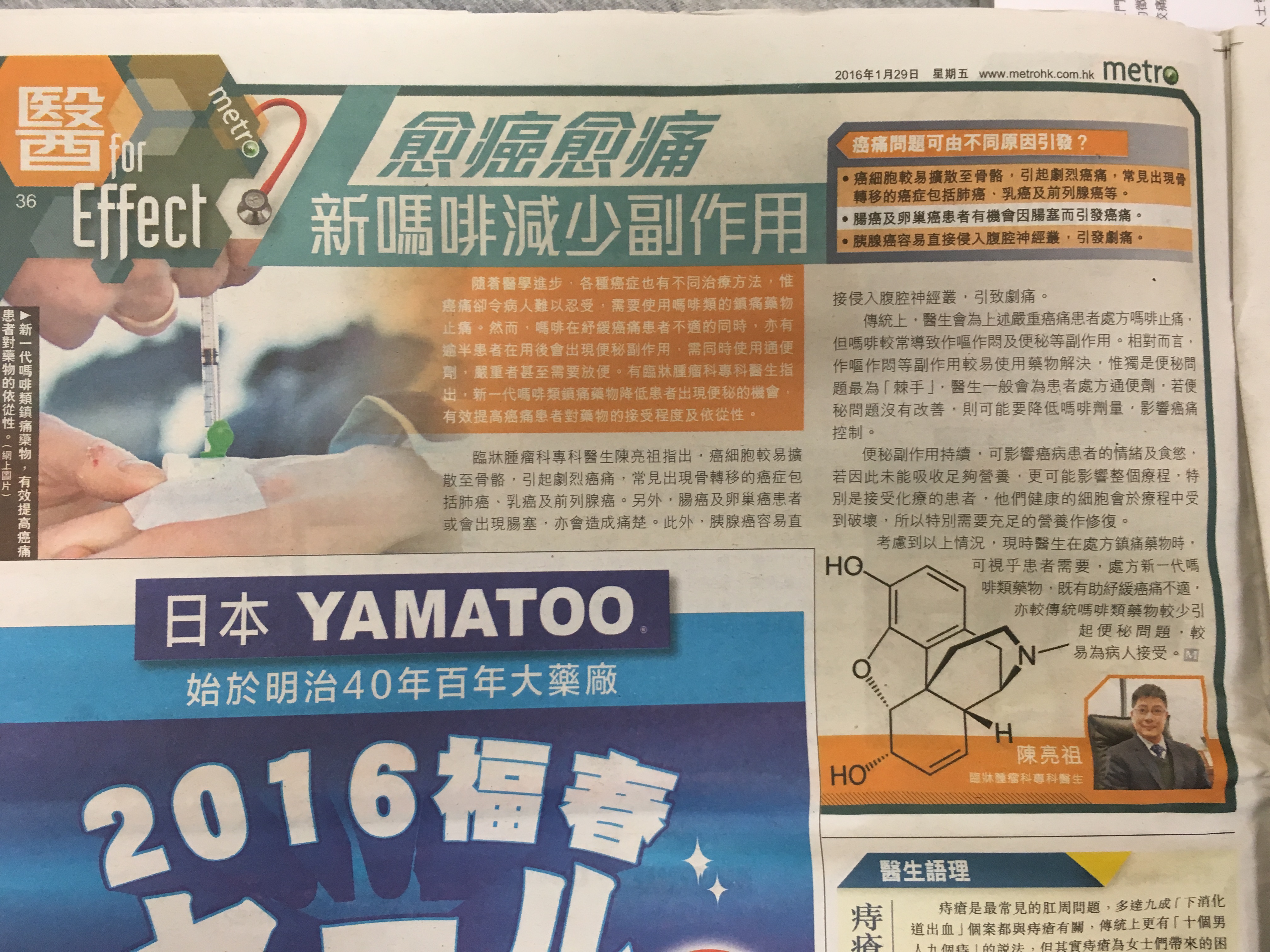 考慮到以上情況,現時醫生在處方鎮痛藥物時,可視乎患者需要,處方新一代嗎啡類藥物,既有助紓緩癌痛不適,亦較傳統嗎啡類藥物較少引起便秘問題,較易為病人接受。