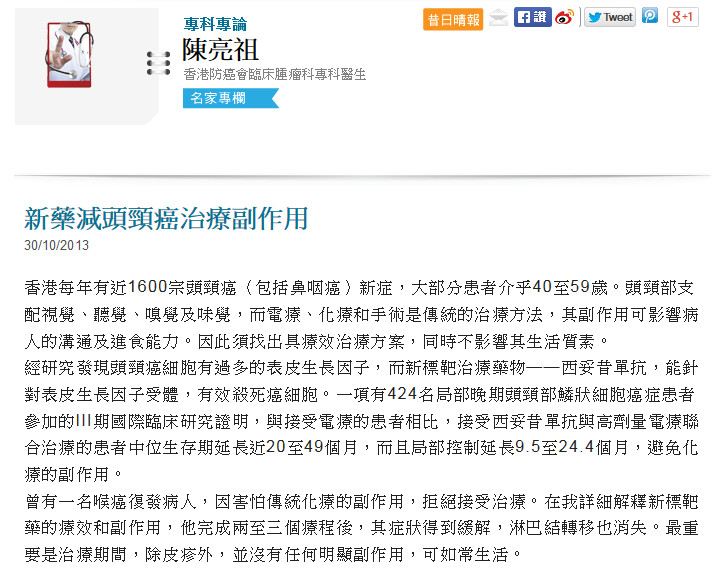 曾有一名喉癌復發病人,因害怕傳統化療的副作用,拒絕接受治療。在我詳細解釋新標靶藥的療效和副作用,他完成兩至三個療程後,其症狀得到緩解,淋巴結轉移也消失。最重要是治療期間,除皮疹外,並沒有任何明顯副作用,可如常生活。