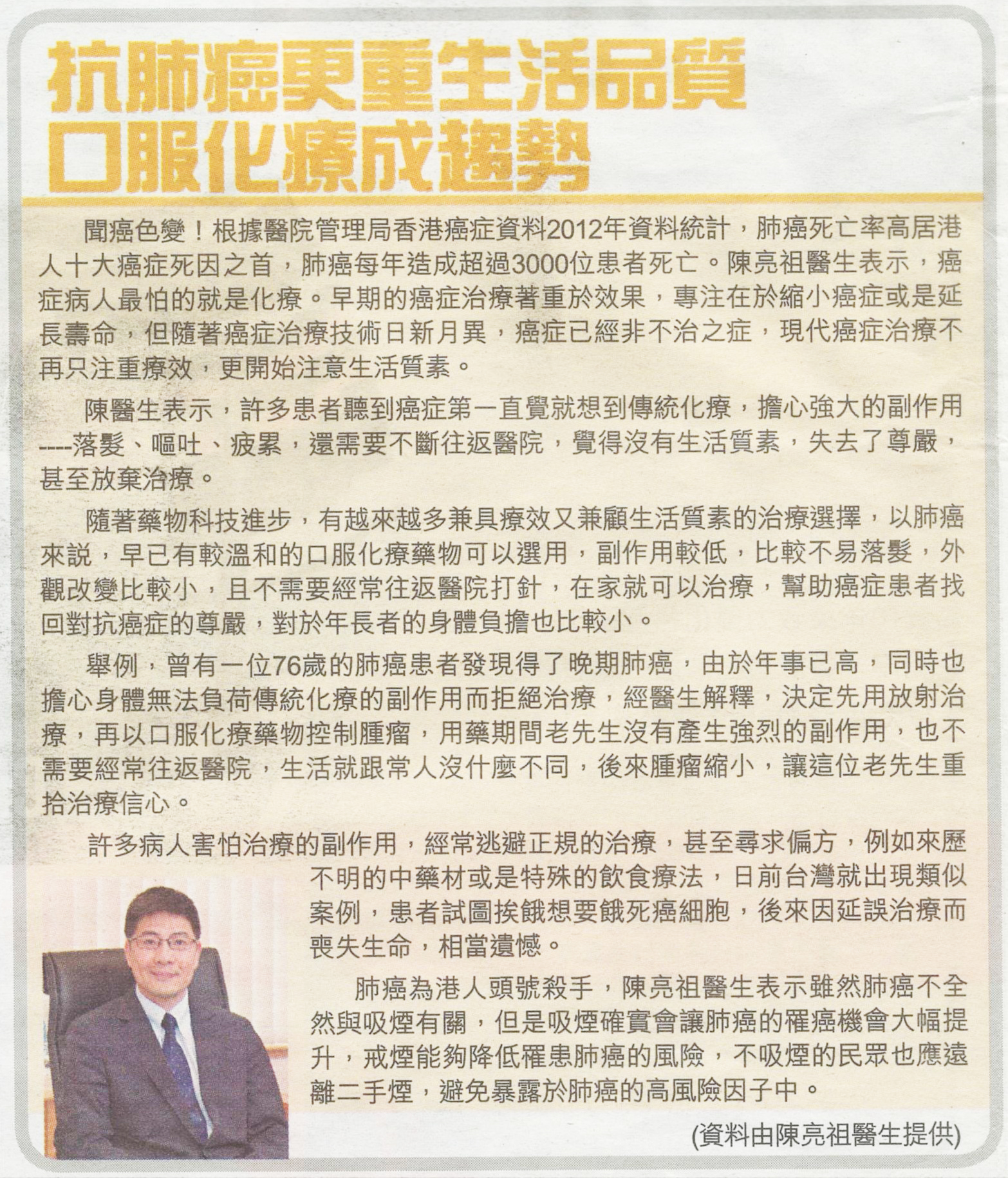聞癌色變!根據醫院管理局香港癌症資料2012年資料統計,肺癌死亡率高居港人十大癌症死因之首,肺癌每年造成超過3000位患者死亡。陳亮祖醫生表示,癌症病人最怕的就是化療。早期的癌症治療着重於效果,專注在於縮小癌症或是延長壽命,但隨着癌症治療技術日新月異,癌症已經非不治之症,現代癌症治療不再只注重療效,更開始注意生活質素。
