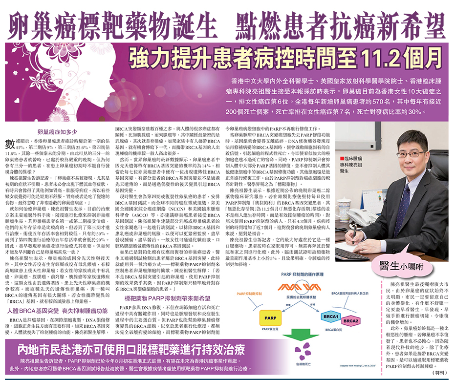 陳亮祖醫生告訴記者,PARP抑制劑已於今年8月初在香港正式註冊,有望在未來為香港抗癌事業作貢獻。此外,內地患者亦可攜帶BRCA基因測試報告赴港就醫,醫生會根據病情考慮使用標靶藥物PARP抑制劑進行治療。