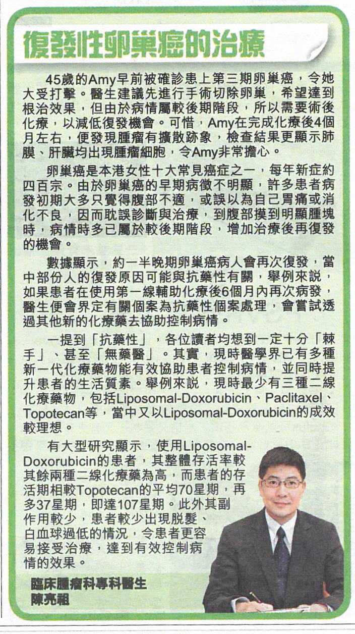 一提到「抗藥性」,各位讀者均想到一定十分「棘手」、甚至「無藥醫」。其實,現時醫學界已有多種新一代化療藥物能有效協助患者控制病情,並同時提升患者的生活質素。舉例來說,現時最少有三種二線化療藥物,包括Liposomal-Doxorubicin、Paclitaxel、Topotecan等,當中又以Liposomal-Doxorubicin的成效較理想。