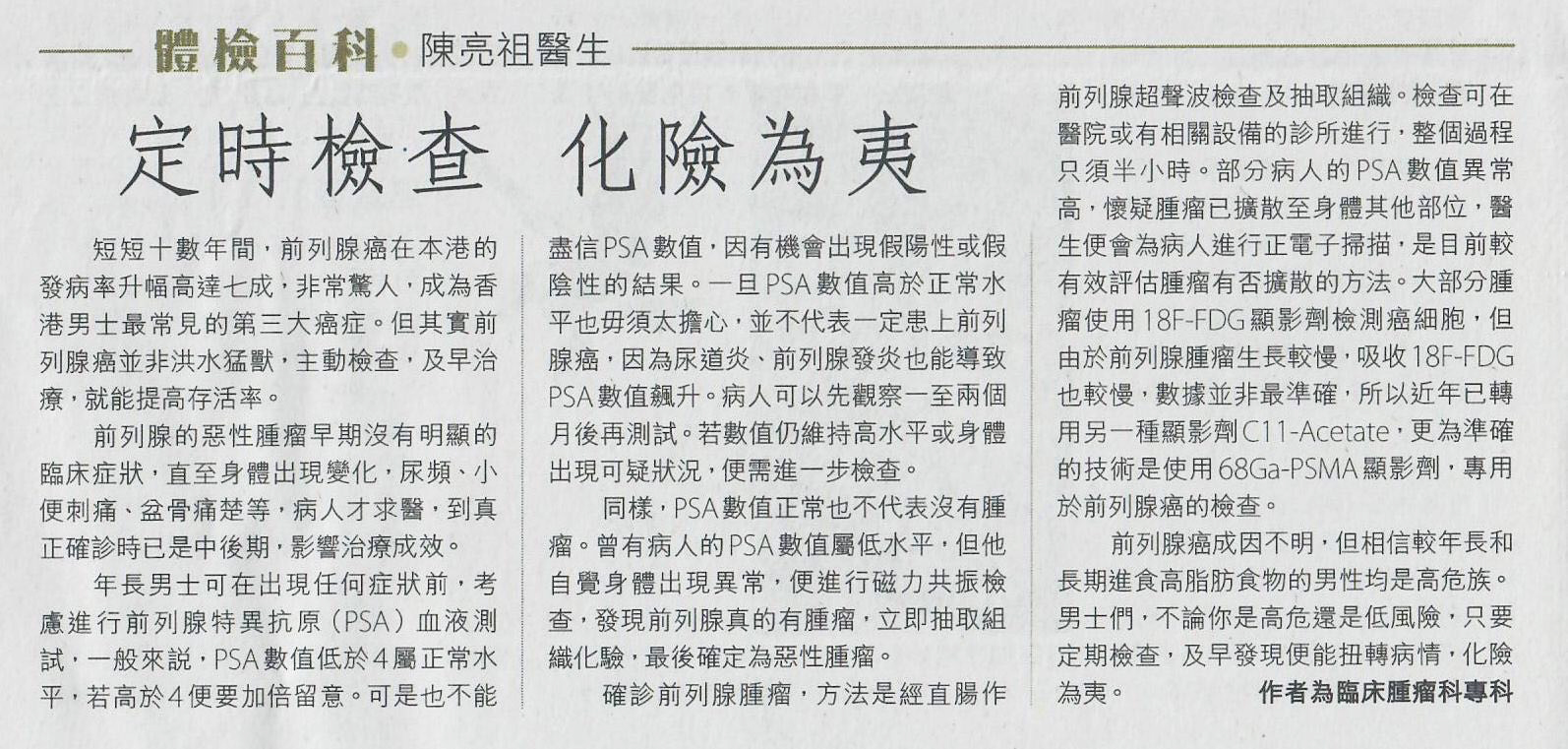 前列腺癌成因不明,但相信較年長和長期進食高脂肪食物的男人,均是高危一族。男士們,不論你是高危還是低風險,只要定期檢查,及早發現便能扭轉病情,化險為夷。