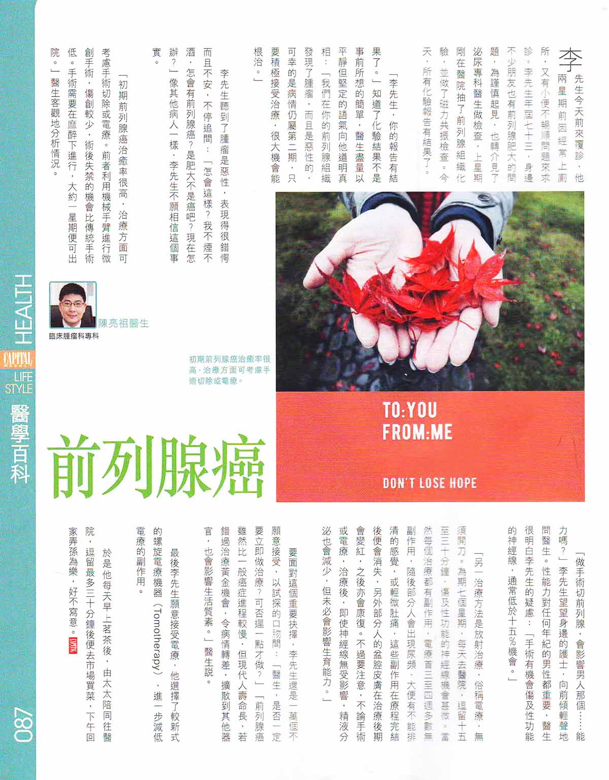 「李先生,你的報告有結果了。」知道了化驗結果不是事前所想的簡單,醫生盡量以平靜但堅定的語氣向他道明真相:「我們在你的前列腺組織發現了腫瘤,而且是惡性的,可幸的是病情仍屬第二期,只要積極接受治療,很大機會能根治。」