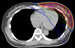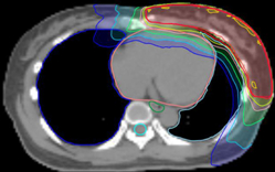此外,由於螺旋刀無須使用等中心(ISO-Centric)的概念,又應用360度全方位調強的特性,因此劑量均勻分佈,比傳統IMRT更加優勝,對重要器官影響也更少。以下圖的乳房治療為例,螺旋刀能造出更好的弧形劑量分佈,以適合胸部 / 乳房的形狀,而肺部,心臟的劑量更少,減低後遺症。