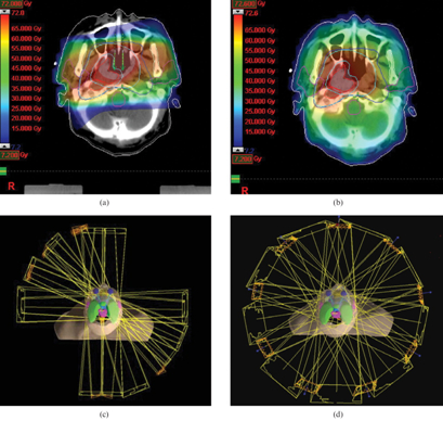 至於調強適形放射治療,是在三維適形放射治療基礎上演進而來。在每個放射束(照射野)內分為許多子野,子野的放射強度是不一樣的(故稱為調強)。過程中劑量的計算,採用逆向設計治療計劃,全部由電腦負責,使腫瘤劑量適形性更好,特別對於不規則形腫瘤或腫瘤附近有重要組織器官需要保護的病例,調強適形放射治療比三維適形放射治療有更好的優勢。