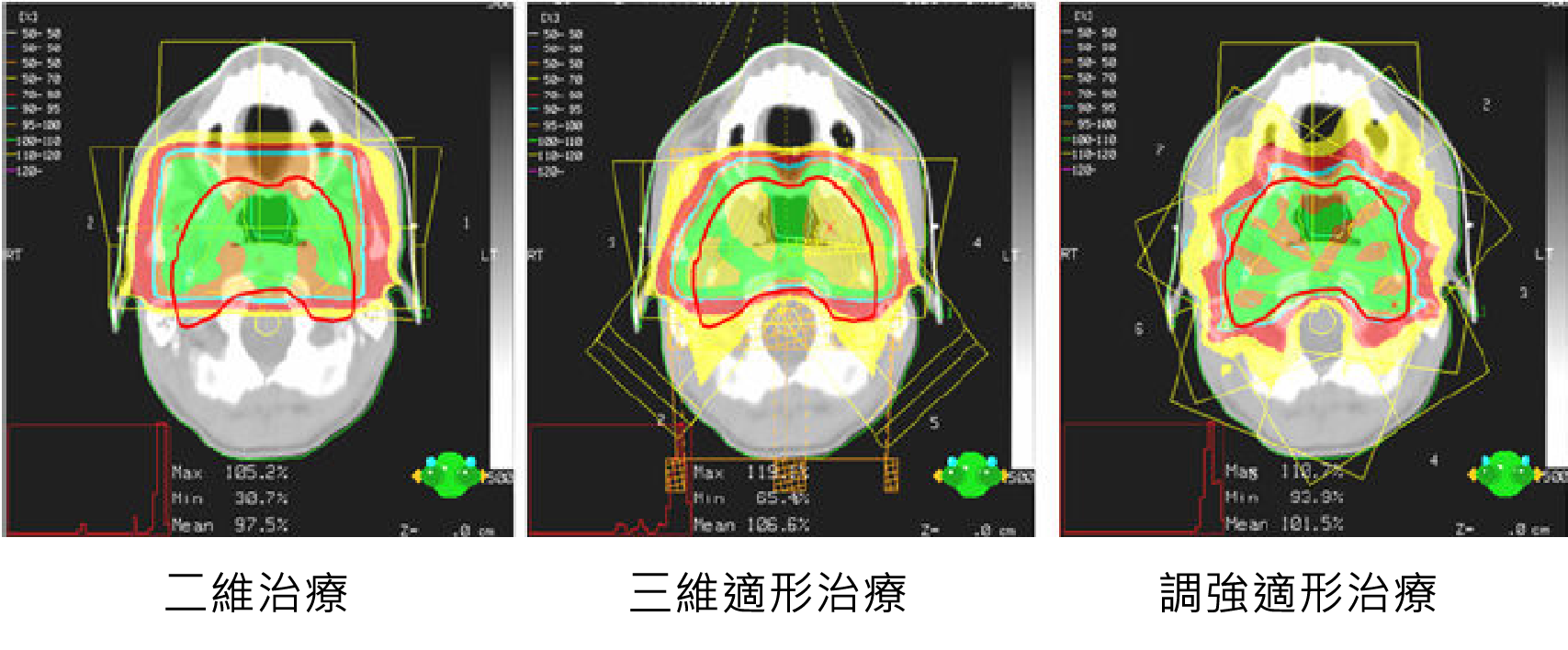 放射技術可分二維(2D)、三維適形(3D-Conformal)及調強適形(Intensity Modulated Radiotherapy - IMRT)等。上世紀80年代,放射治療以二維技術為主,電療劑量以人手計算,最多只容許四個同一平面的放射光束,而且照射野以方形為主,未能對應腫瘤的形狀作出優化,以至放射範圍太寬鬆,未能減低放射線對正常組織的傷害。而醫生作電療規劃時,多數以平面X光片為主,即使有CT或MRI影像,也只能作為參考,未能將三維數據作實際電療設計之用。