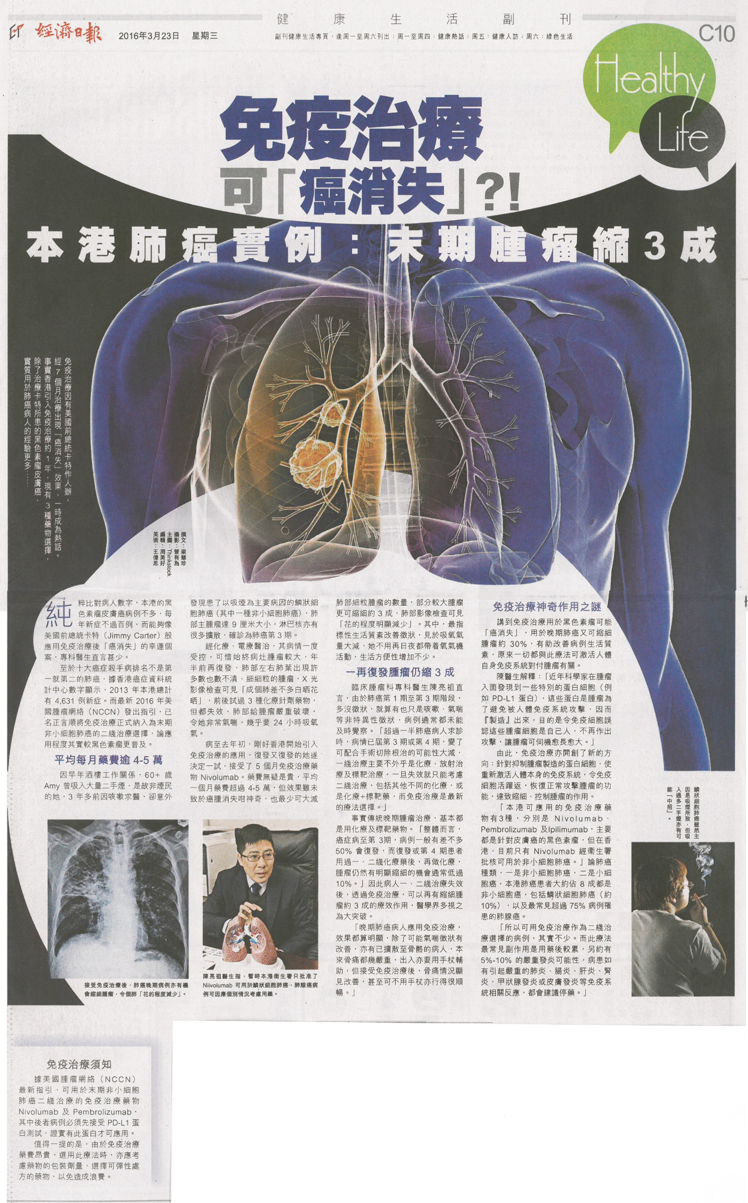 至於十大癌症殺手病排名不是第一就第二的肺癌,據香港癌症資料統計中心數字顯示,2013年本港總計有4,631例新症。而最新2016年美國腫瘤網絡(NCCN)發出指引,名正言順將其中兩種標靶藥物治療藥物Nivolumab及Pembrolizumab,正式納入為末期非小細胞肺癌的二線治療選擇,論應用程度其實較黑色素瘤更普及。