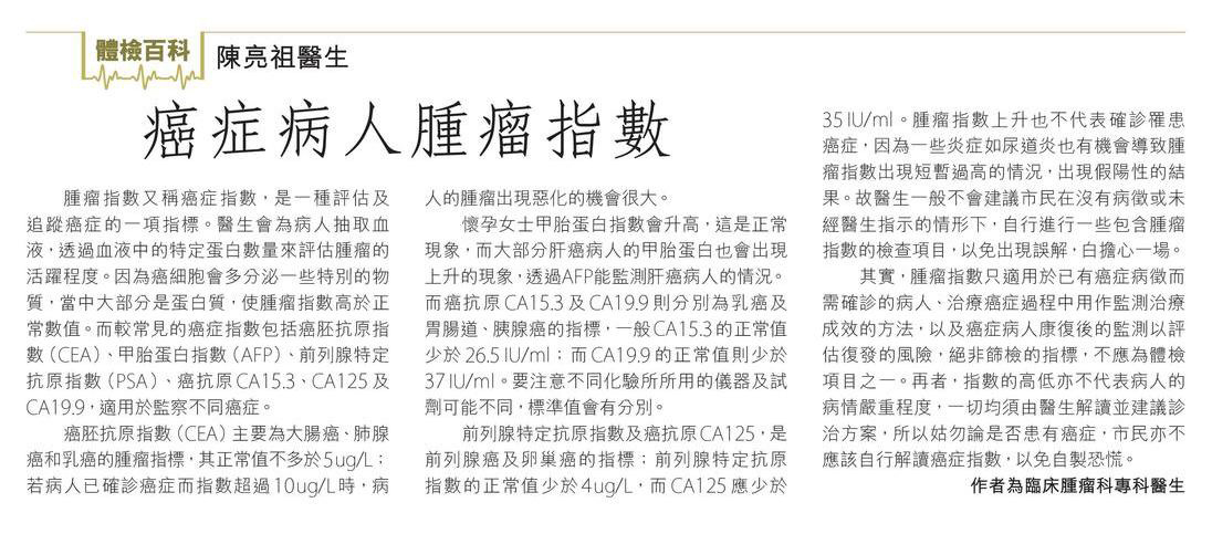 其實,腫瘤指數只適用於已有癌症病徵而需確診的病人、治療癌症過程中用作監測治療成效的方法,以及癌症病人康復後的監測以評估復發的風險,絕非篩查的指標,不應為體檢項目之一。再者,指數的高低亦不代表病人的病情嚴重程度,一切均須由醫生解讀並建議診治方案,所以姑勿論是否患有癌症,市民亦不應該自行解讀癌症指數,以免自製恐慌。